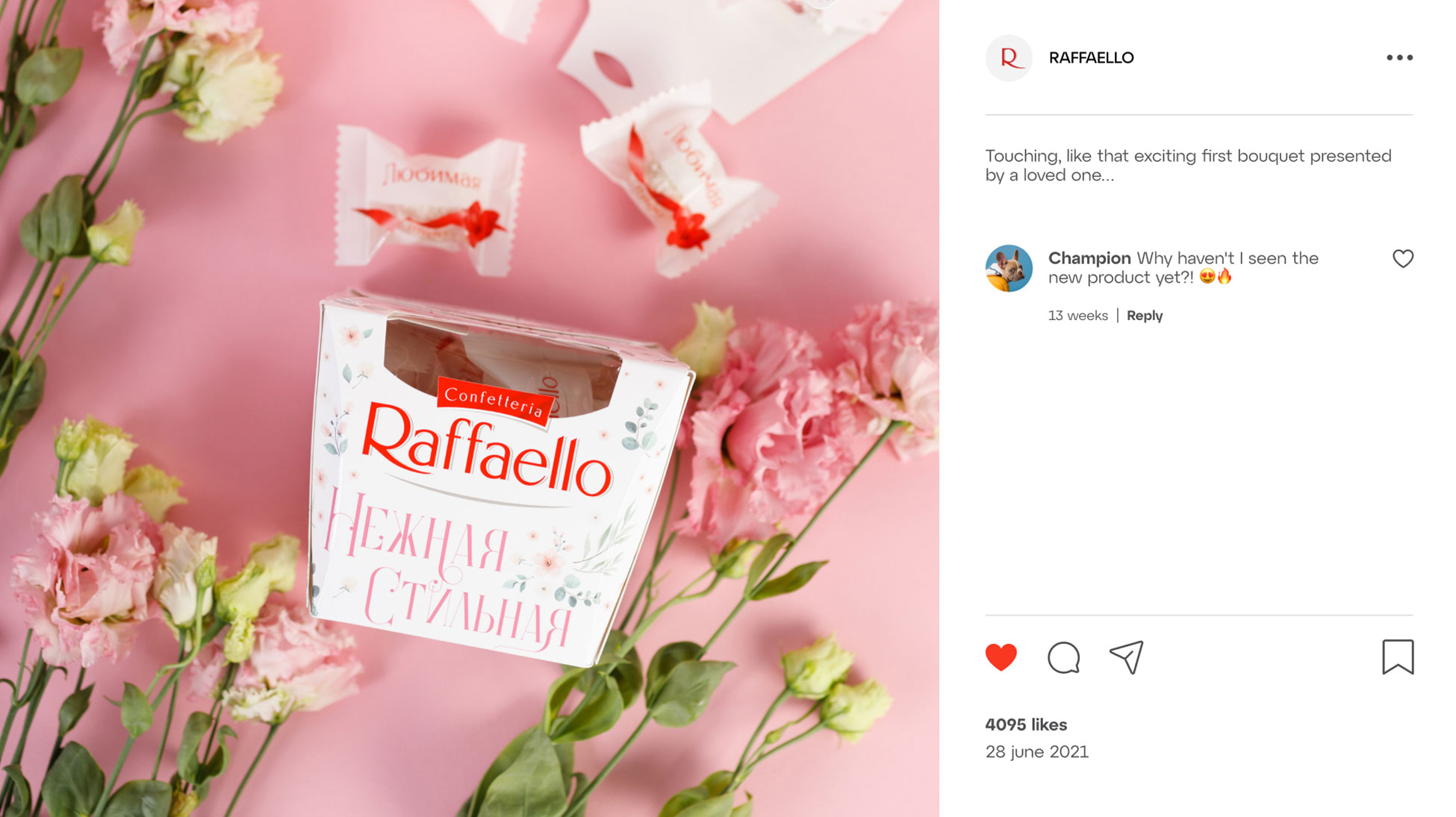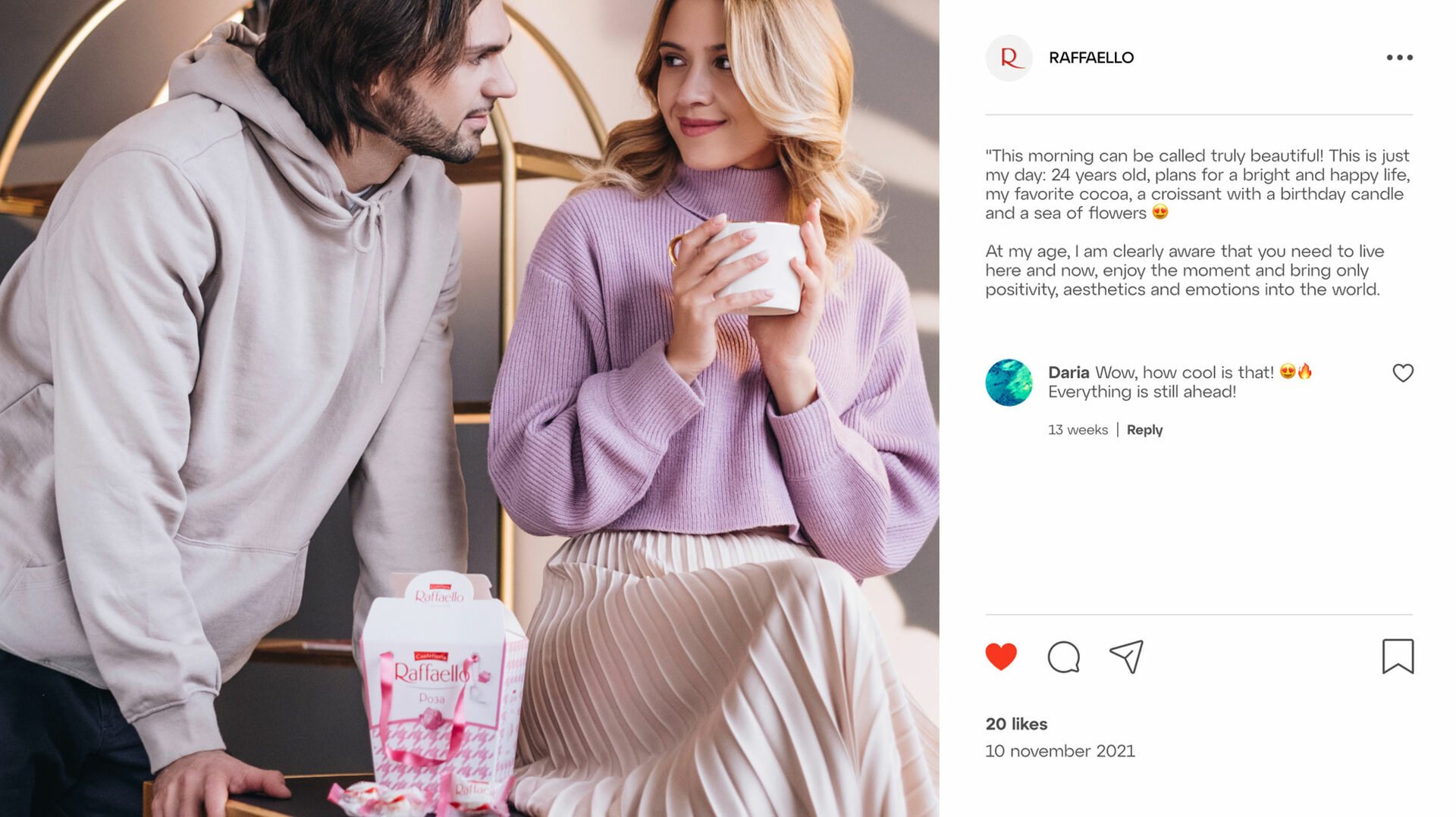 Our main task was to create unique content in line with Raffaello's philosophy - photo shoots, creative concepts, copywriting and social media moderation.