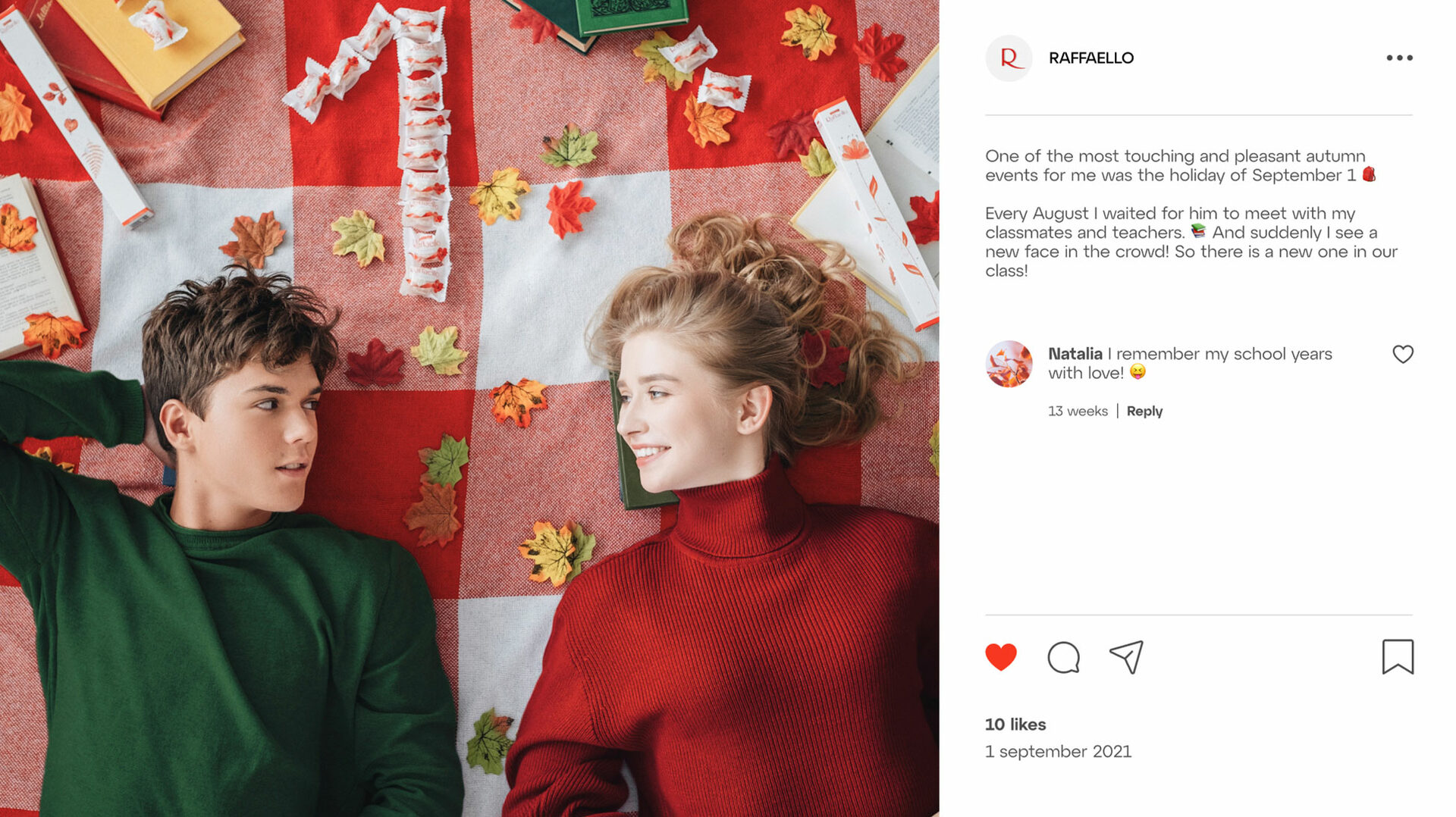 As part of the project, we created content for several seasons: the school season, the launch of the new Raffaello "Rose" flavor, the New Year's season and the spring season, including the holidays of International Women's Day and Defender of the Fatherland Day . The content for each season had a certain recognizable style.